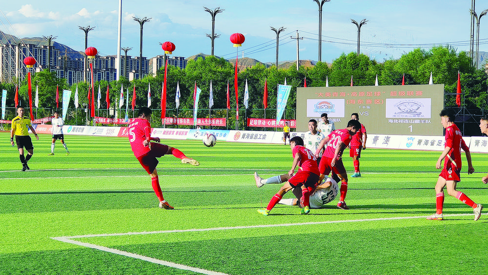 第一個進球后,海東隊持續(xù)發(fā)動進攻,多次制造威脅,海北隊爭搶激烈,上半場進行到23分鐘時,海東隊再進一球,以2比0的比分暫時領先。攻防不斷轉(zhuǎn)換,海北隊也不甘示弱,通過高舉高打的戰(zhàn)術(shù),突破海東隊防線,將比分扳為2:1。