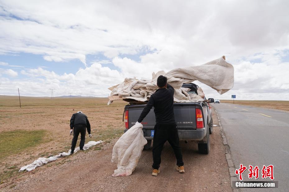6月20日,三江源國家公園長江源園區(qū)可可西里管理處五道梁保護站的2名生態(tài)管護員將青藏公路沿線垃圾撿起裝車。中新社記者 馬銘言 攝