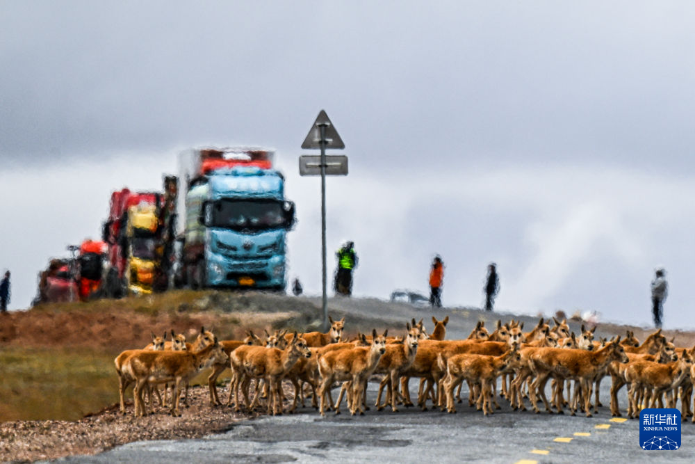 2024年5月27日,藏羚羊在可可西里五道梁地區(qū)通過(guò)青藏公路。新華社記者 張龍 攝