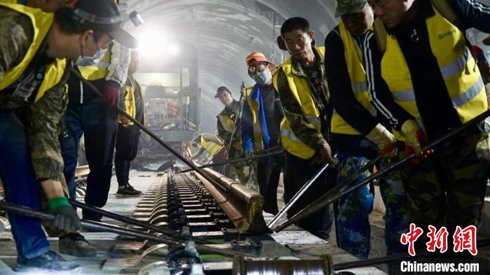川青鐵路鎮(zhèn)黃段隧道內(nèi)鋪軌作業(yè)現(xiàn)場(chǎng)。成蘭鐵路公司供圖