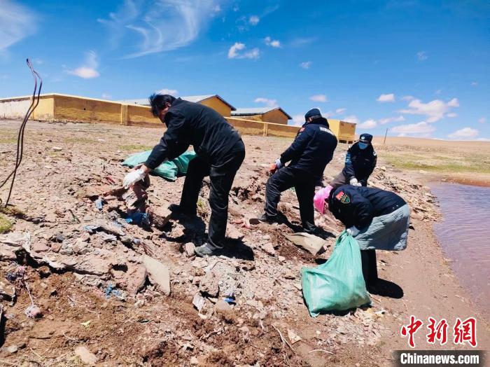 圖為長江源村生態(tài)管護(hù)員巡護(hù)時撿拾垃圾。青海省海西州格爾木市委組織部供圖