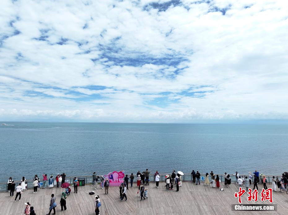 7月8日,航拍游客在青海省海南藏族自治州共和縣青海湖二郎劍景區(qū)內(nèi)觀光。(無人機照片)中新社記者 馬銘言 攝