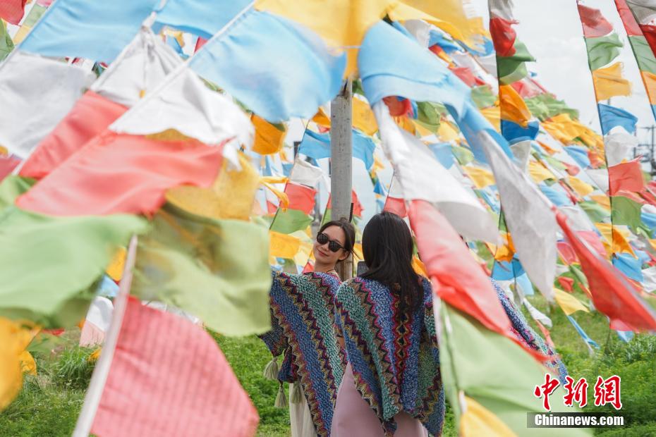 7月8日,游客在青海省海南藏族自治州共和縣青海湖二郎劍景區(qū)內(nèi)拍照打卡。中新社記者 馬銘言 攝