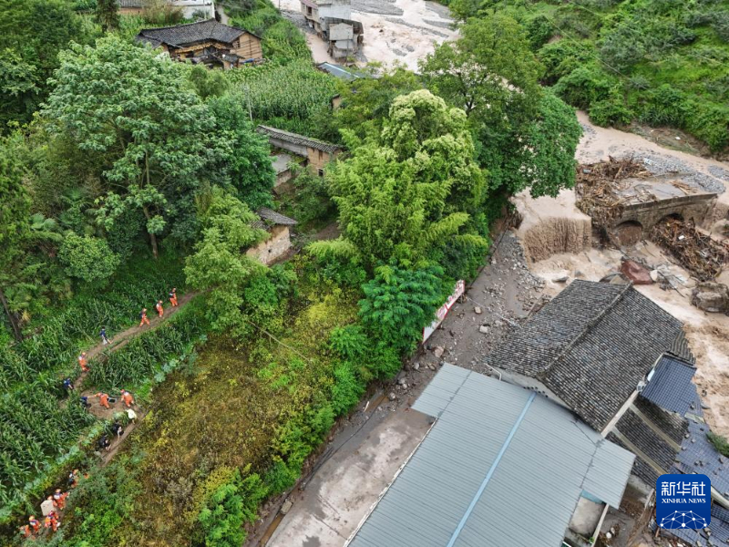 7月21日,救援人員在四川省雅安市漢源縣馬烈鄉(xiāng)新華村進行搜救(無人機照片)。新華社記者 王曦 攝