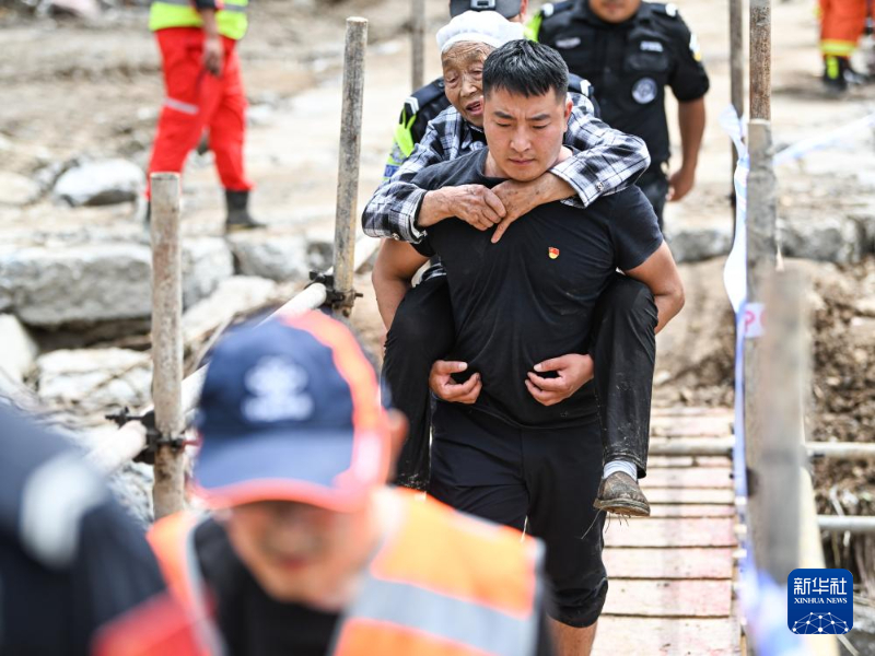 7月21日,在四川省雅安市漢源縣馬烈鄉(xiāng)新華村,救援人員在轉(zhuǎn)移受災(zāi)群眾。新華社記者 王曦 攝