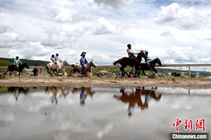 7月30日,四川理塘,參賽選手們快速?gòu)馁悎?chǎng)一處水塘邊通過(guò)。中新社記者 劉忠俊 攝