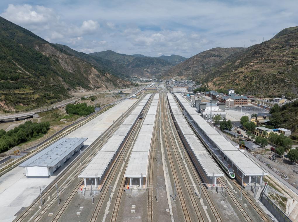 一輛調試列車停靠在川青鐵路松潘站(8月29日攝)。新華社記者 江宏景 攝
