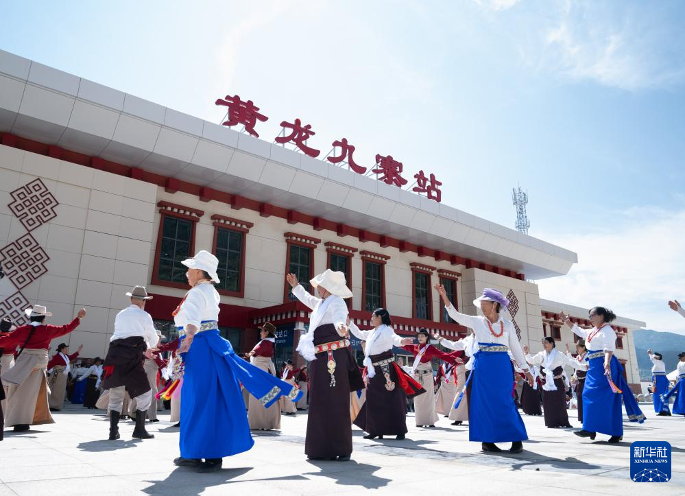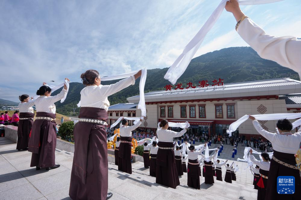 8月30日,在黃龍九寨站,當地群眾在川青鐵路鎮(zhèn)江關至黃勝關段開通首發(fā)儀式上跳舞慶祝。新華社記者 江宏景 攝