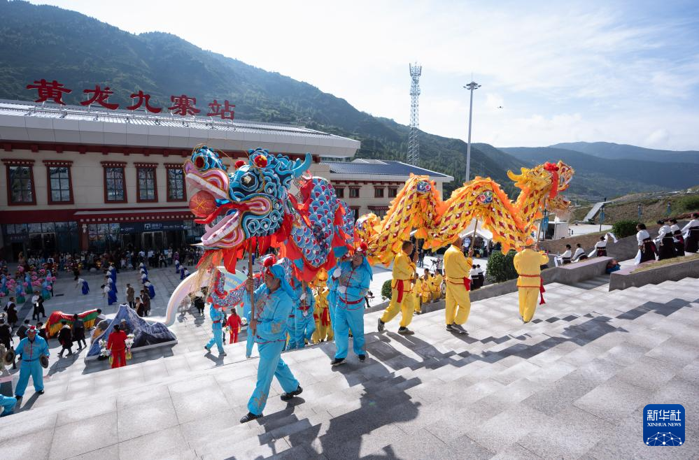 8月30日,在黃龍九寨站,當地群眾在川青鐵路鎮(zhèn)江關至黃勝關段開通首發(fā)儀式上舞龍。新華社記者 江宏景 攝