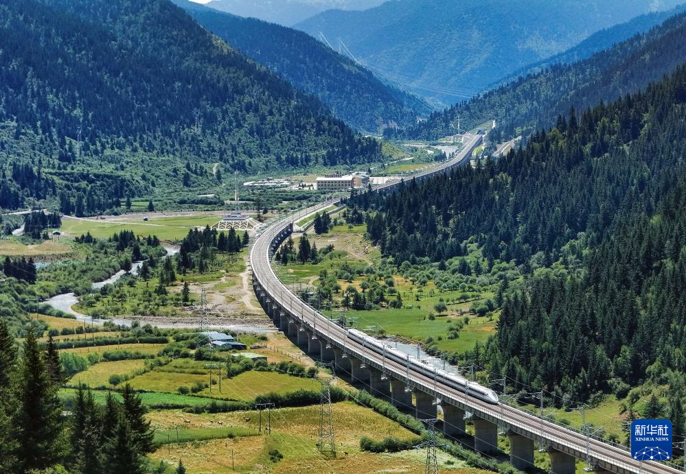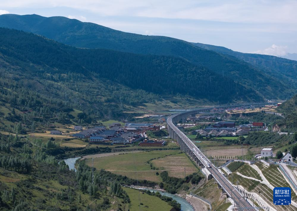 一列試運行列車行進在黃勝關站至黃龍九寨站間(8月29日攝,無人機照片)。新華社記者 江宏景 攝