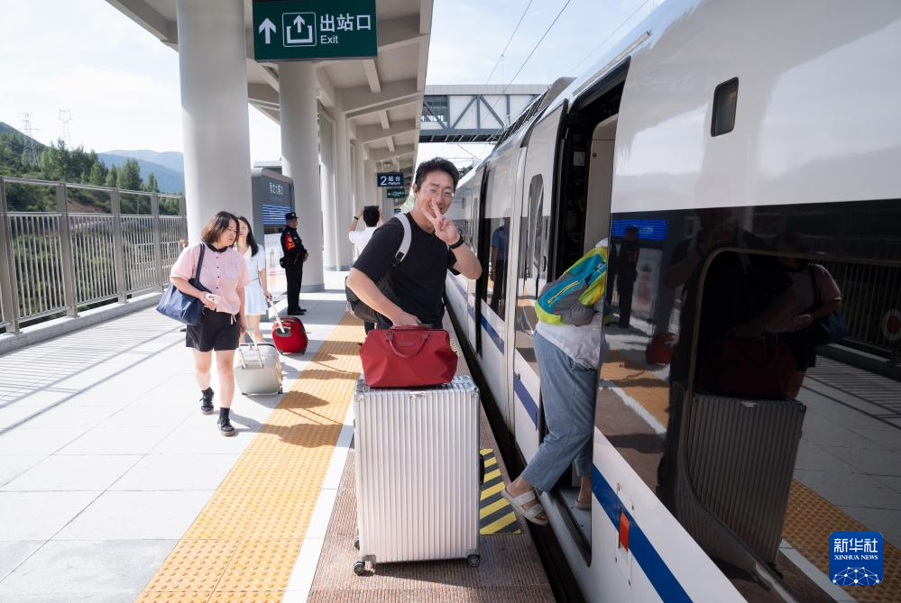 8月30日,來自廣東的游客從黃龍九寨站登上首發(fā)列車C5818次列車。新華社記者 江宏景 攝