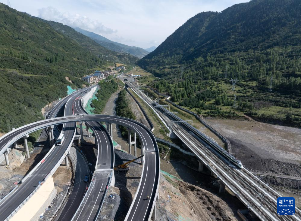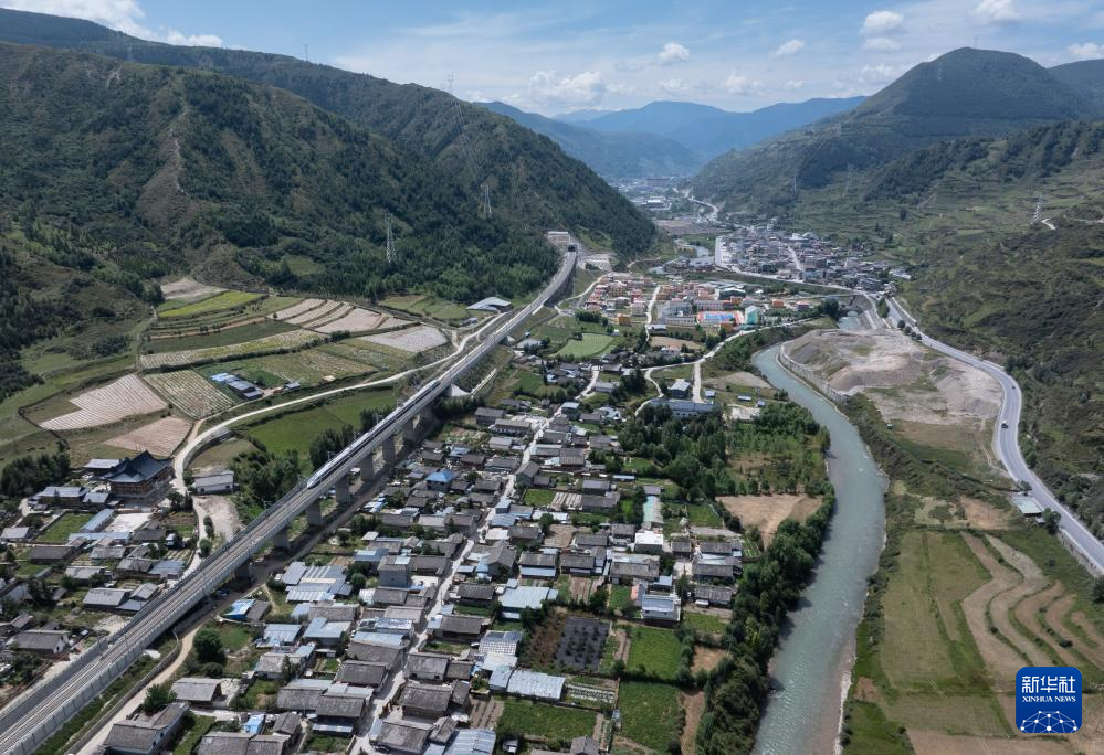 C5764次列車行進在川青鐵路黃龍九寨站至松潘站間,鐵路邊是岷江和213國道(8月30日攝,無人機照片)。新華社記者 江宏景 攝