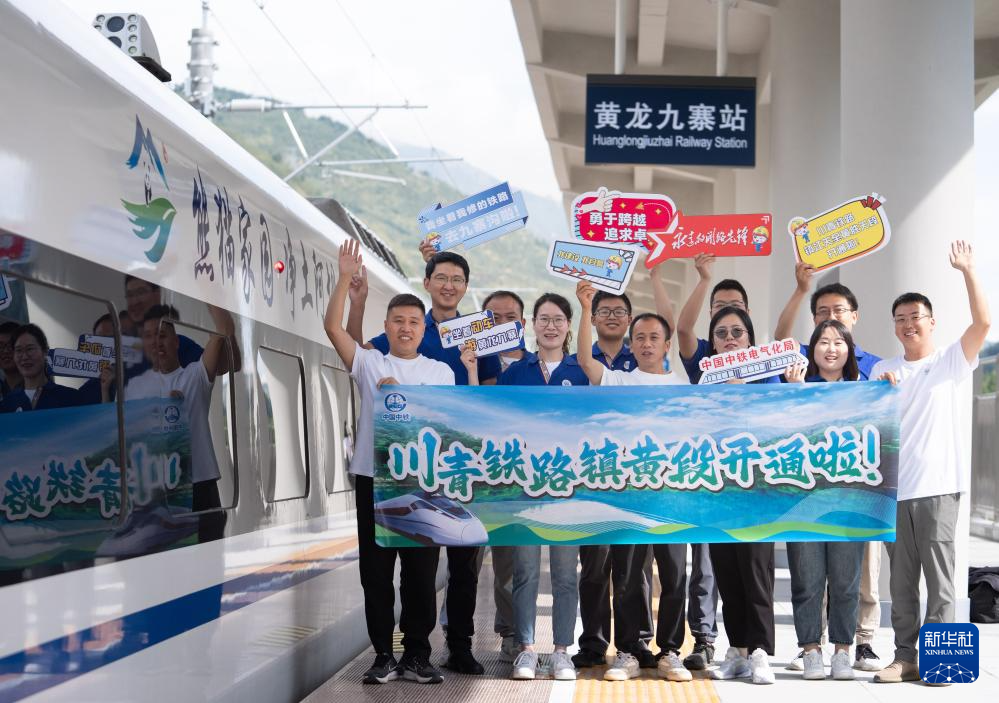 8月30日,參與川青鐵路鎮(zhèn)江關至黃勝關段修建的中國中鐵電氣化局員工在黃龍九寨站首發(fā)列車前留影。新華社記者 江宏景 攝