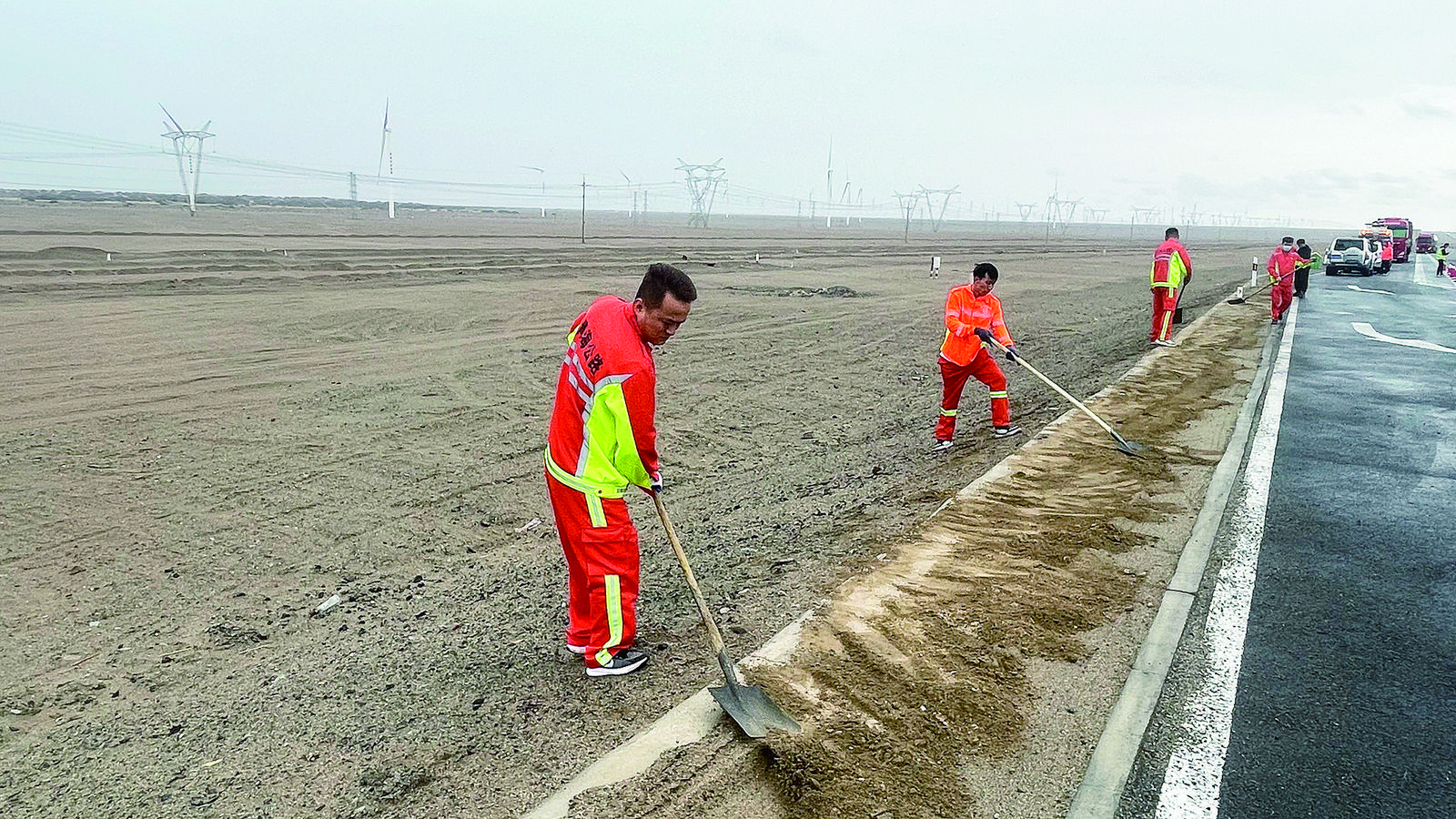東出格爾木,沿著青藏公路109國道朝著都蘭方向一路東行,來來往往的車輛川流不息。在距離格爾木市區(qū)46公里的路旁,一群身著橘色工作服的養(yǎng)路工人,正默默清理著路域環(huán)境,帶隊的是工區(qū)負責人王明軍。