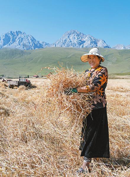 8月25日,甘孜縣仁果鄉(xiāng)有機青稞基地,聯(lián)合收割機完成收割后,德西青措將青稞秸稈打捆。今年她家的青稞再次增產(chǎn)。何海洋 攝