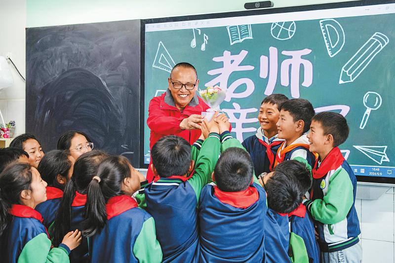 9月10日,2023年到阿壩州紅原縣城關(guān)小學支教的綿陽市鹽亭縣高渠小學張恩君老師收到了孩子們的教師節(jié)祝福。他克服各種困難,為高原孩子帶去知識。何海洋 攝