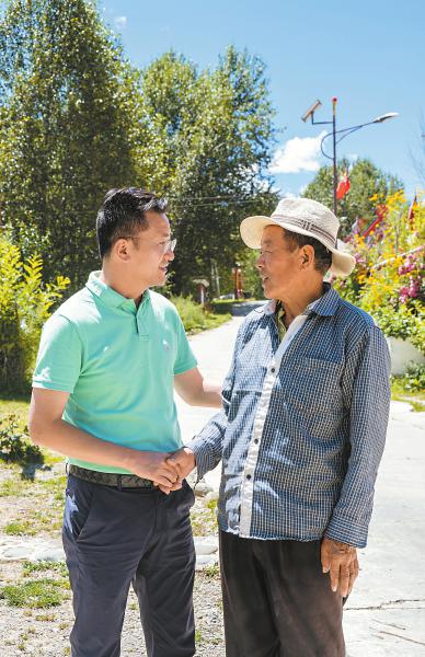8月21日,甘孜州爐霍縣雅德鄉(xiāng)交納村“博士名譽村長”張藜山(左)與村民拉家常。自去年擔任“村長”以來,他致力于發(fā)展電商和旅游產(chǎn)業(yè),成為鄉(xiāng)村振興的“新引擎”。何海洋 攝