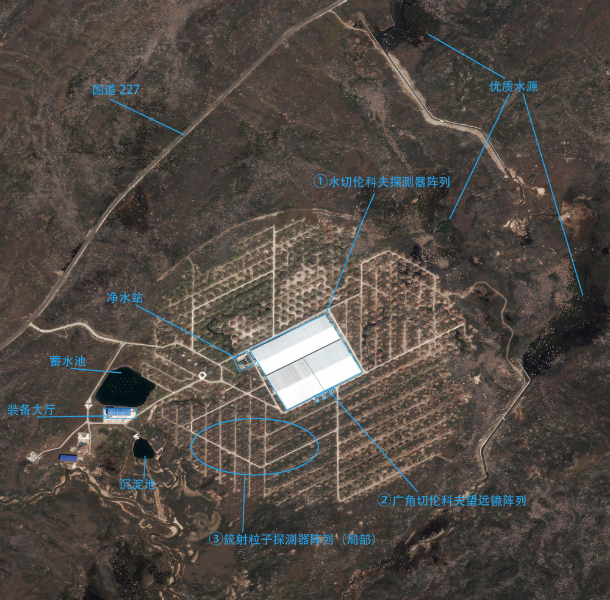 從衛(wèi)星影像示意圖上可以看到,“拉索”毗鄰國道,地勢(shì)整體平坦,優(yōu)質(zhì)水源豐富。得益于世界屋脊的高海拔優(yōu)勢(shì)和多項(xiàng)關(guān)鍵核心技術(shù)的突破,“拉索”集合了三項(xiàng)“世界之最”:最靈敏的超高能伽馬射線探測(cè)裝置,最靈敏的甚高能伽馬射線源巡天普查望遠(yuǎn)鏡,能量覆蓋范圍最寬的超高能宇宙線復(fù)合式立體測(cè)量系統(tǒng)。自2021年“拉索”完成建設(shè)投入使用以來,成績斐然。
