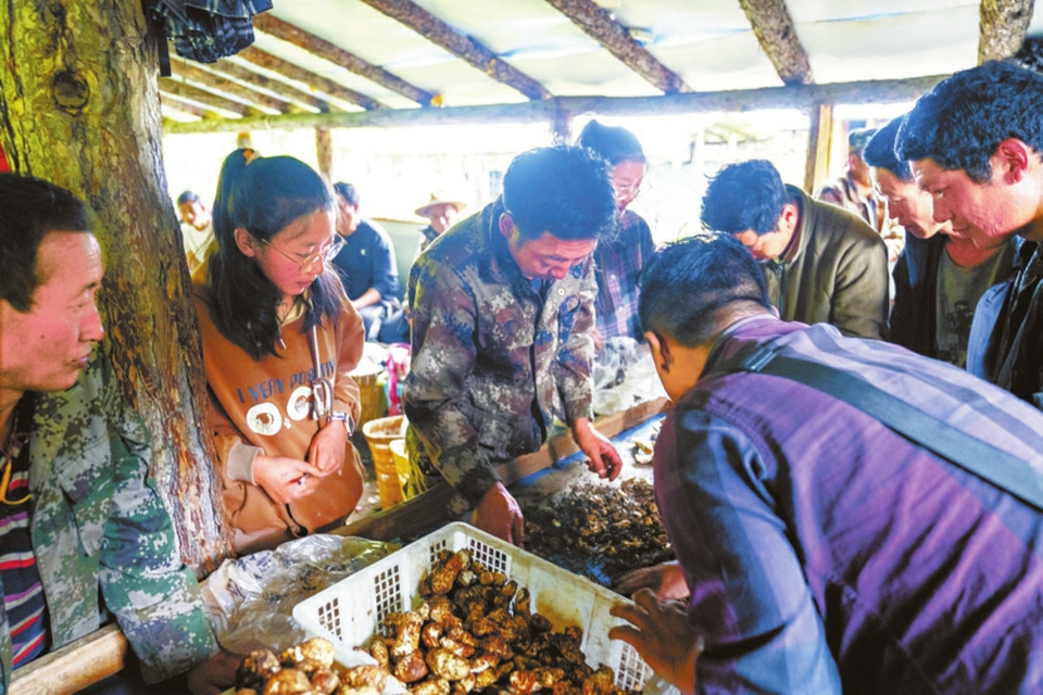 根呷曲比最喜歡喊價(jià)環(huán)節(jié)。價(jià)格是“喊”出來的,卻不是常見的“此起彼伏、扯著嗓門”式地叫價(jià),得益于市場(chǎng)的管理機(jī)制,松茸的收購價(jià)格由收貨商和村民代表商量出來。