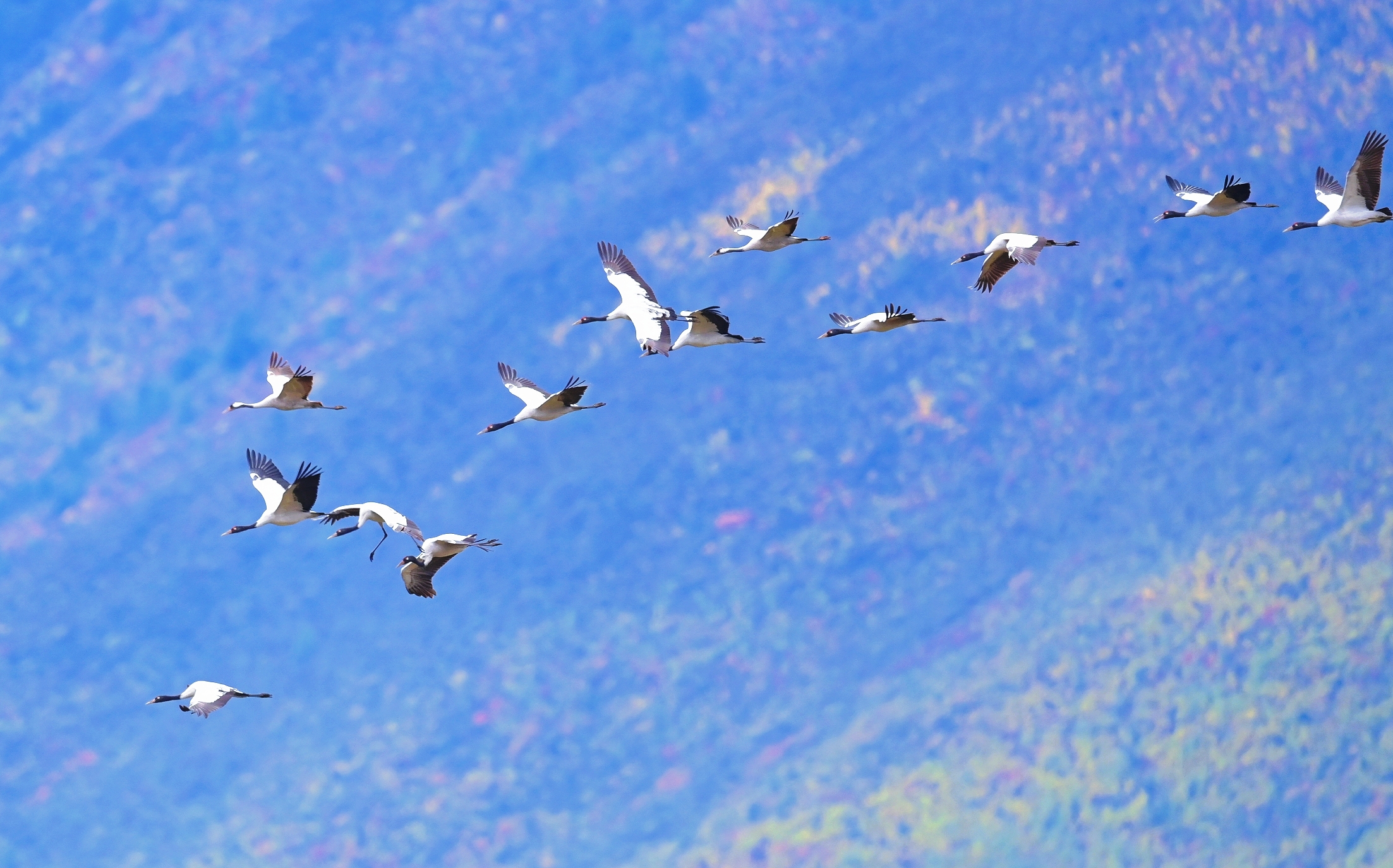 近日,香格里拉市納帕海省級自然保護(hù)區(qū)管護(hù)局工作人員監(jiān)測發(fā)現(xiàn),今年首批越冬黑頸鶴已飛抵納帕海。工作人員共監(jiān)測到黑頸鶴34只,其中幼鳥4只,與黑頸鶴同期飛抵的還有灰鶴2只,黑鸛61只。
