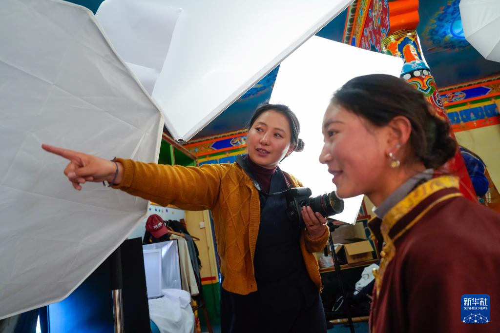 在“欽樂工坊”的攝影棚,達(dá)瓦卓瑪(左)指導(dǎo)模特如何擺姿勢(shì)拍攝品牌耳釘飾品(11月4日攝)。新華社記者 沈伯韓 攝