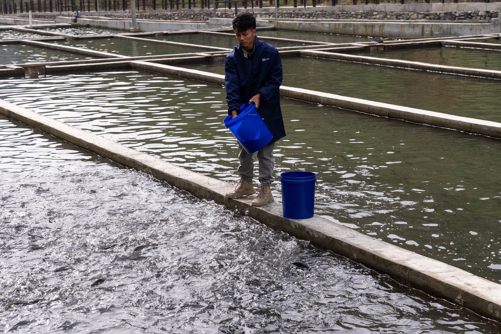 工作人員喂食冷水魚。