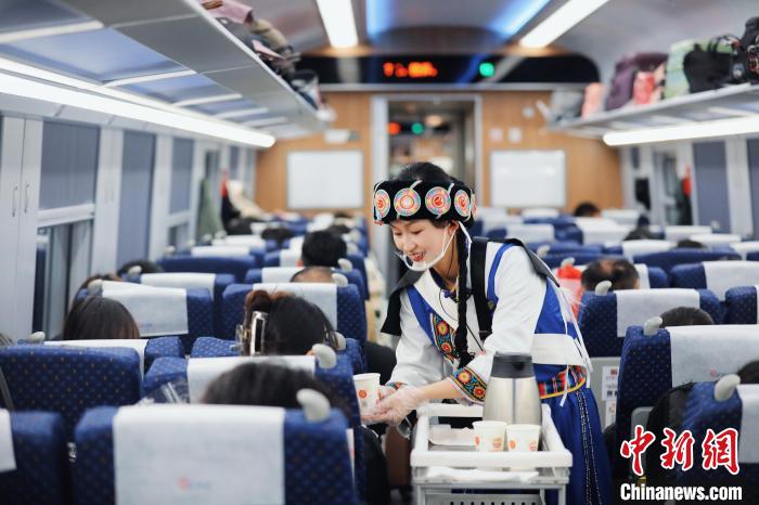 圖為乘務(wù)員為乘客送上酥油茶。楊紫軒 攝