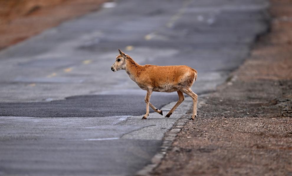 在可可西里,一只雌性待產(chǎn)藏羚羊通過青藏公路(2023年5月28日攝)。新華社記者 張宏祥 攝
