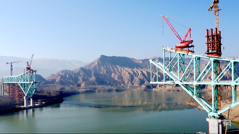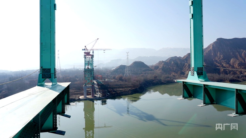 圖為12月20日拍攝的尖扎黃河特大橋施工現(xiàn)場。央廣網(wǎng)記者 汪曉青 攝