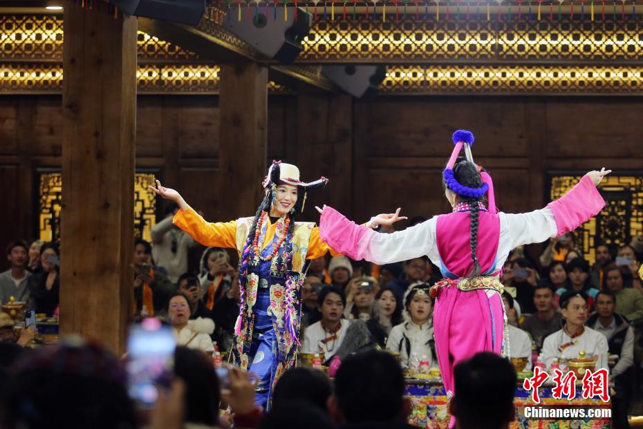 12月24日,香格里拉演員為游客進(jìn)行表演。地處云南西北部的迪慶藏族自治州香格里拉市,是云南熱門旅游地,也是世人向往的世外桃源。近年來,該州圍繞“冬看日照金山嬉雪觀鳥”的主題,不斷豐富業(yè)態(tài)服務(wù)好游客,推動(dòng)冰雪世界“冷資源”變?yōu)椤盁峤?jīng)濟(jì)”。中新社記者 黃興鴻 攝