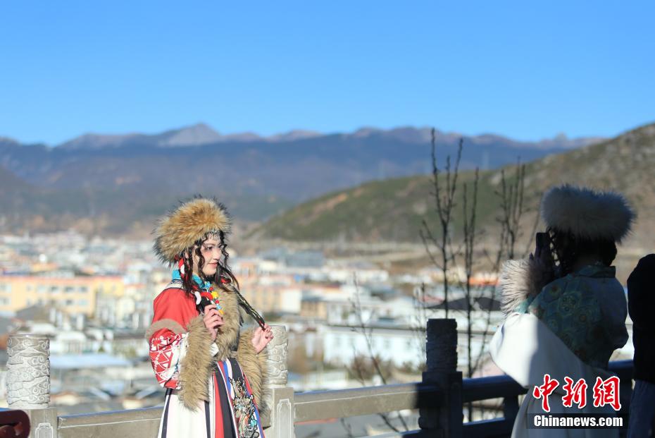 12月23日,游客身著藏裝打卡獨(dú)克宗古城。地處云南西北部的迪慶藏族自治州香格里拉市,是云南熱門旅游地,也是世人向往的世外桃源。近年來,該州圍繞“冬看日照金山嬉雪觀鳥”的主題,不斷豐富業(yè)態(tài)服務(wù)好游客,推動(dòng)冰雪世界“冷資源”變?yōu)椤盁峤?jīng)濟(jì)”。中新社記者 黃興鴻 攝