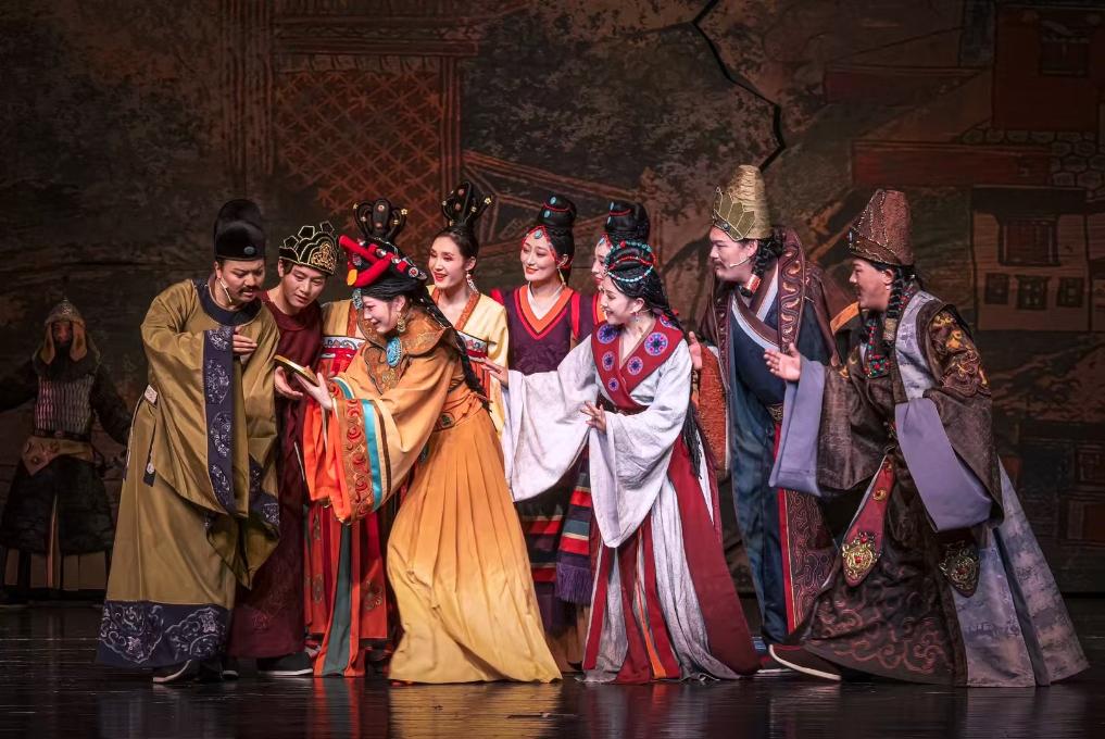舞臺上,《金城公主》以精湛的表演和細(xì)膩的情感刻畫,將一段具有歷史深邃感的唐蕃和盟故事娓娓道來。“我的主要目標(biāo)是盡可能地學(xué)習(xí)民間藏戲,深入了解傳統(tǒng)的演唱風(fēng)格和發(fā)聲方法,為創(chuàng)新表演方式打下基礎(chǔ)?!?1歲的藏戲演員仁青東智在劇中扮演唐中宗,他是西藏大學(xué)聲樂系研究生,在校時(shí)學(xué)習(xí)意大利美聲唱法,畢業(yè)后在藏戲中找到了自己的熱愛。
