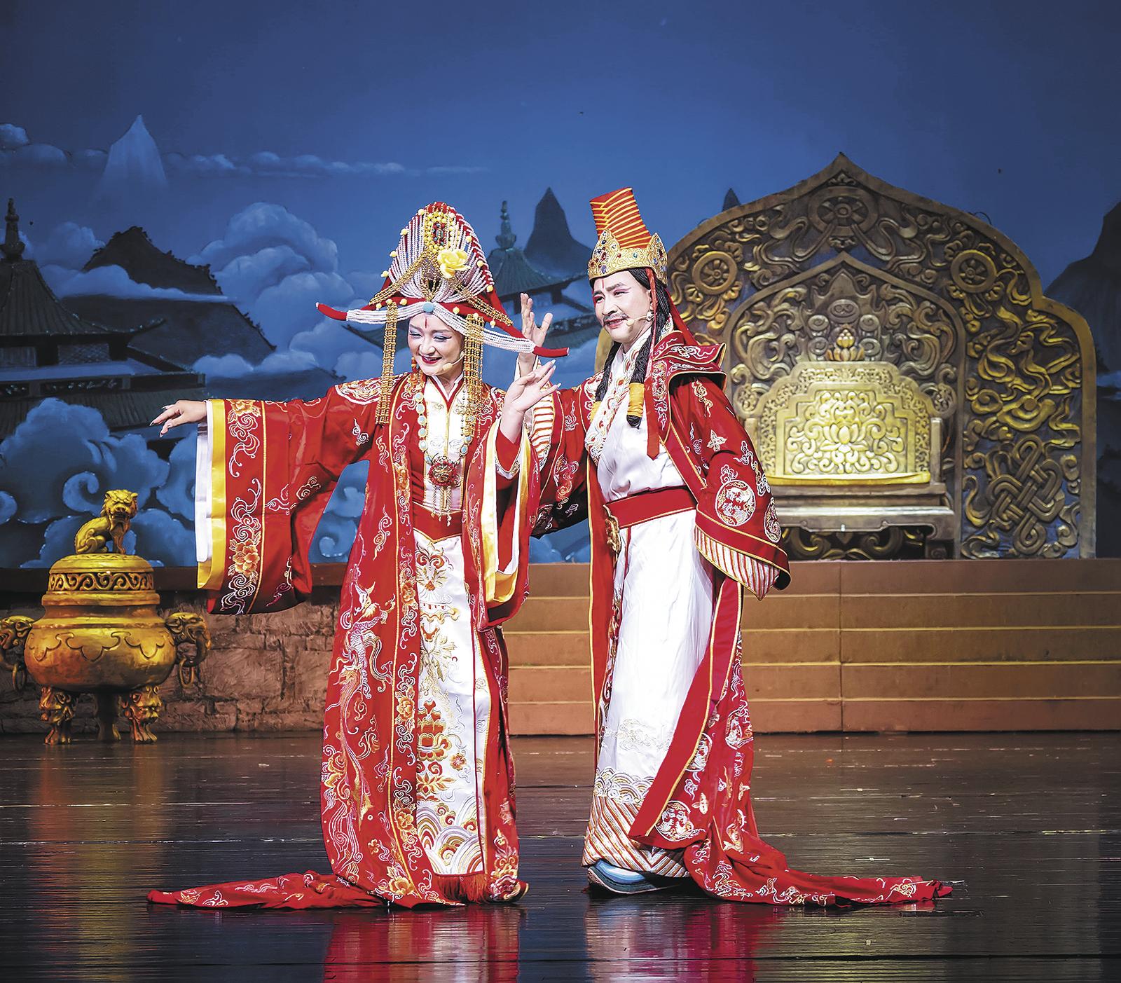 表演開始,藏戲獨特的唱腔響起,演員們身著華麗厚重、色彩斑斕的藏戲服飾登場?,F(xiàn)場鼓撥聲交織,演員們的唱詞和念白抑揚頓挫,講述著金城公主為促進漢藏文化交流、促進民族團結(jié)做出的卓越貢獻。