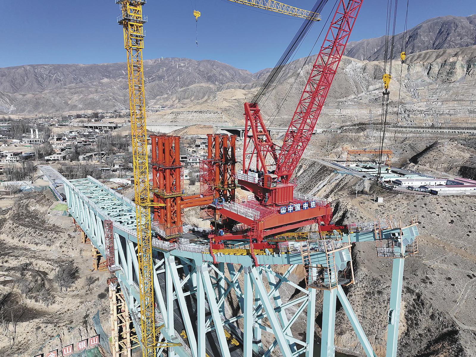 “川青鐵路尖扎黃河特大橋主橋鋼桁拱架設(shè)進(jìn)度過(guò)半。”看著這一片熱火朝天、有序建設(shè)的場(chǎng)景,川青鐵路11標(biāo)中鐵大橋局項(xiàng)目黨支部書記瞿小荃滿懷信心地介紹起項(xiàng)目進(jìn)度,“黃河北岸已經(jīng)完成第14節(jié)間架設(shè),南岸完成第12節(jié)間架設(shè),主橋需要完成50個(gè)節(jié)間,目前共完成26個(gè)節(jié)間架設(shè)?!?/p>