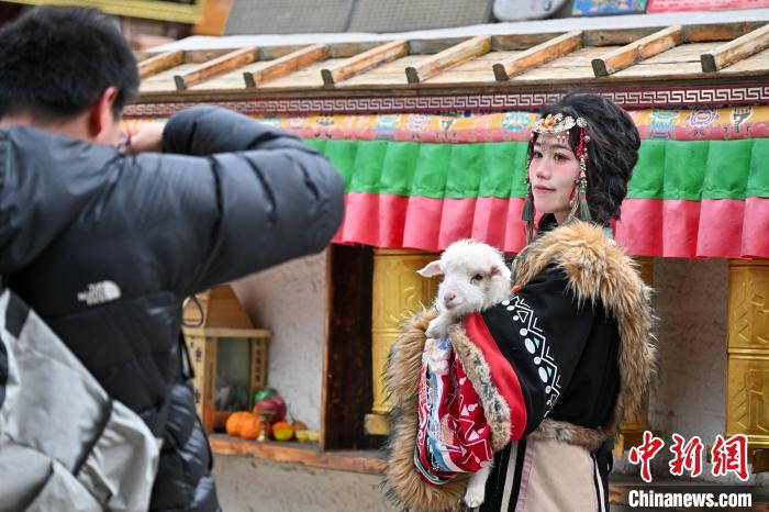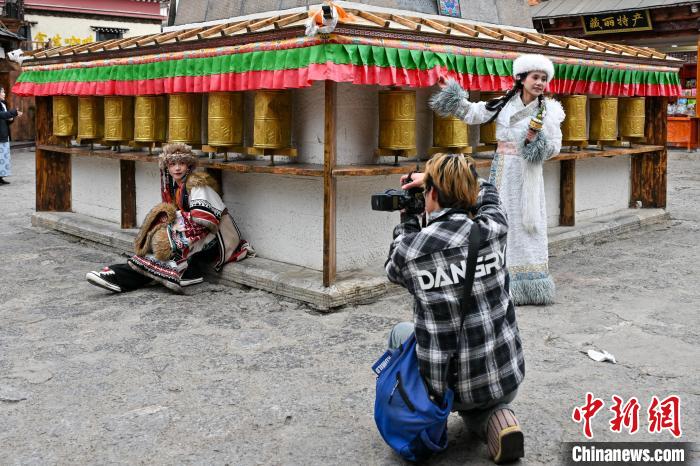 3月1日,游客身著富有民族風(fēng)情的服裝在獨克宗古城拍照。中新社記者 李嘉嫻 攝