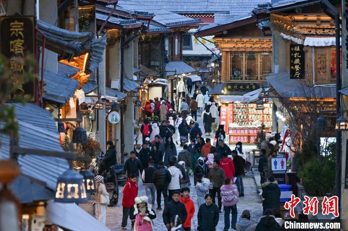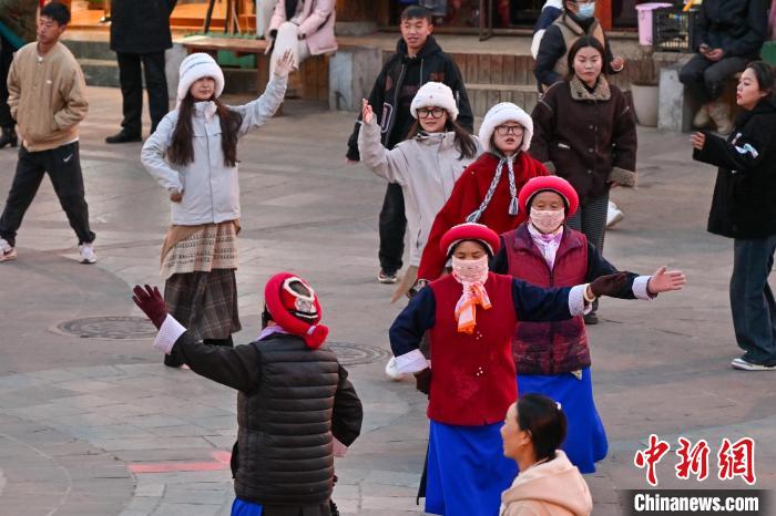 3月1日,游客在獨克宗古城與當?shù)鼐用褚煌鴱V場舞。中新社記者 李嘉嫻 攝