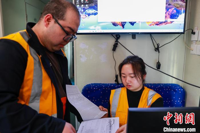 4月27日,中國鐵路青藏集團有限公司西寧工務(wù)機械段養(yǎng)路機械駕駛員俞慶(右一)與同事交接文件。中新社記者 薛蒂 攝