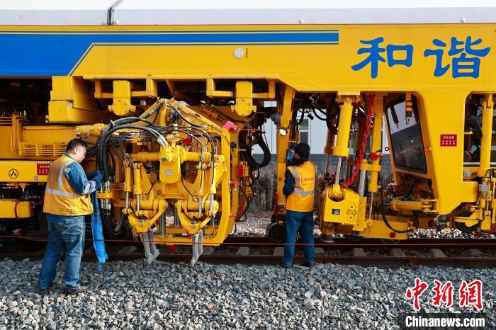 4月27日,中國鐵路青藏集團有限公司西寧工務(wù)機械段養(yǎng)路機械駕駛員俞慶(右一)和同事一起保養(yǎng)設(shè)備。中新社記者 薛蒂 攝