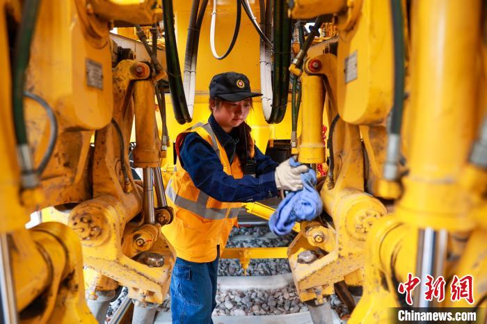 4月27日,中國鐵路青藏集團有限公司西寧工務(wù)機械段養(yǎng)路機械駕駛員俞慶擦拭搗固車工作裝置。中新社記者 薛蒂 攝