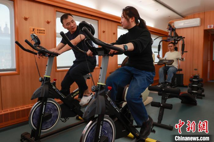 4月27日,中國鐵路青藏集團有限公司西寧工務(wù)機械段養(yǎng)路機械駕駛員余慶(右一)和同事在宿營車內(nèi)健身。中新社記者 薛蒂 攝