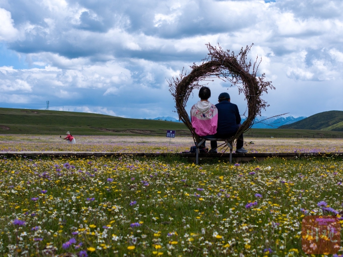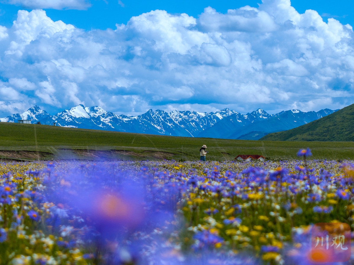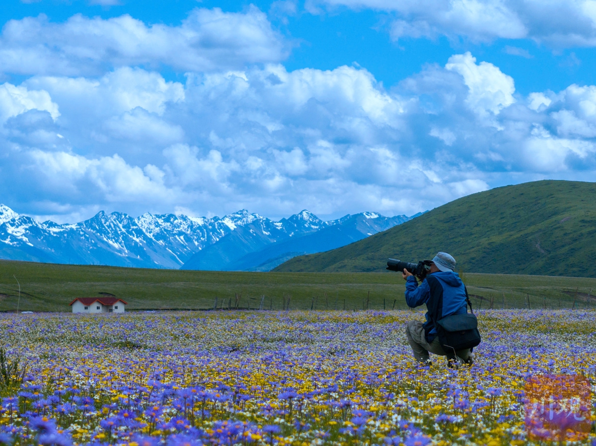 6月25日,游人在花海間遠眺草原、雪山美景。陳先林 攝