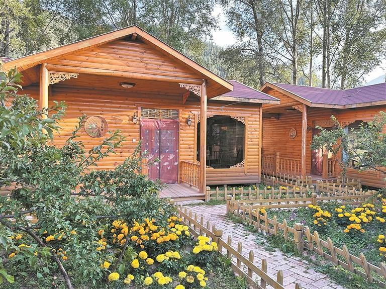 環(huán)視一周,幾座木質(zhì)小屋映入眼簾,原木色外觀透著古香古色的韻味;屋前精心布置的花園里,鵝黃、橘紅、煙紫的花兒開(kāi)得燦爛,綠葉繁茂的樹(shù)木點(diǎn)綴其間,滿是生機(jī);一條磚石鋪就的小徑延伸向小屋門(mén)廊,周?chē)鷺?shù)木蔥郁,整體環(huán)境清幽雅致。