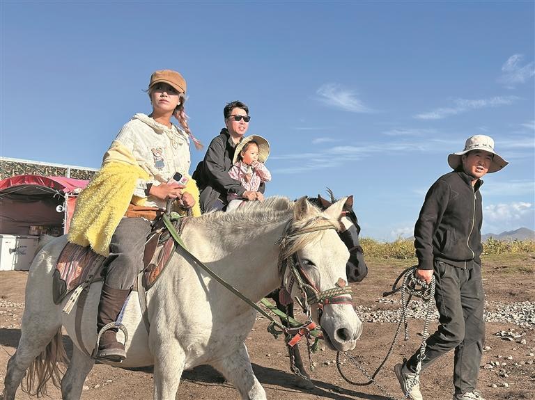 “您好,要體驗(yàn)騎馬嗎?”游客一來(lái),村民們便熱情地上前詢問(wèn)。談好價(jià)格后,他們細(xì)心調(diào)整馬鞍,攙扶游客上馬,再牽著韁繩放緩腳步,帶著游客開(kāi)啟沉浸式草原騎行。身下的馬兒穩(wěn)步踏過(guò)草原,遠(yuǎn)處連綿起伏的山巒被秋意暈染出深淺不一的色彩,游客或舉著手機(jī)記錄風(fēng)光,或迎著風(fēng)感受草原的遼闊,盡情沉醉在秋日祁連的壯美風(fēng)光里。
