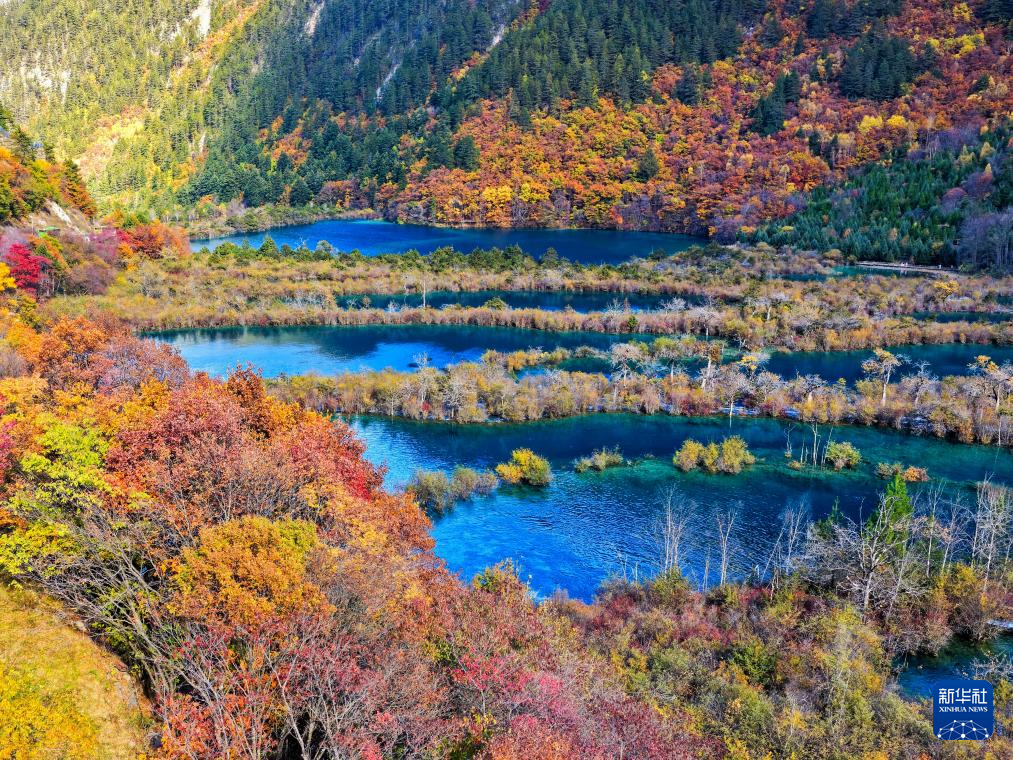 這是2025年11月10日拍攝的九寨溝景區(qū)樹正群海一景(無人機照片)。新華社發(fā)(梁楓攝)