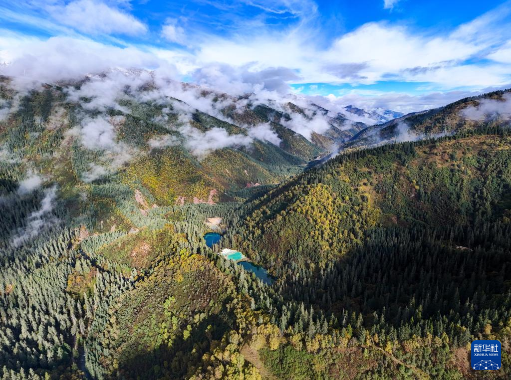這是2024年10月12日拍攝的九寨溝縣神仙池景區(qū)內(nèi)的高原湖泊和鈣化池(無人機照片)。新華社記者 王曦 攝