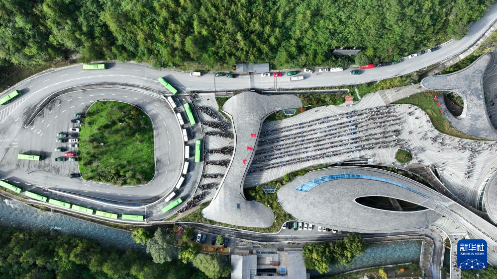游客排隊陸續(xù)進入九寨溝景區(qū)(2025年10月2日攝,無人機照片)。新華社發(fā)(梁楓攝)