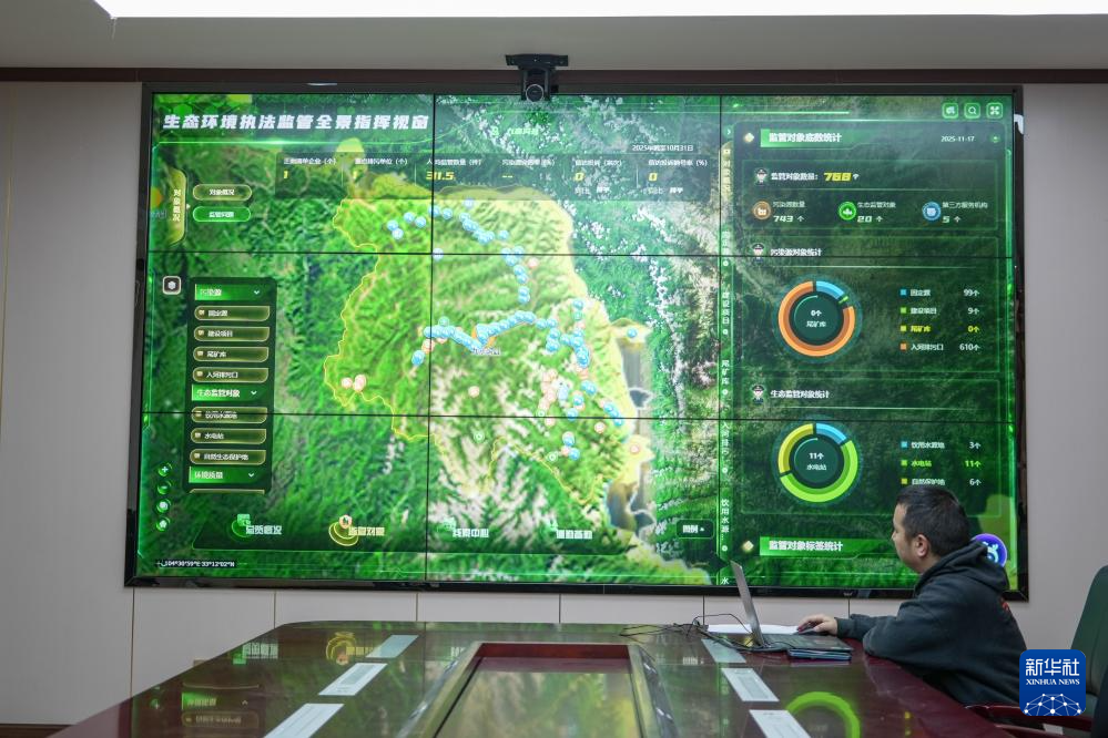 在九寨溝縣生態(tài)環(huán)境局,工作人員在查看生態(tài)環(huán)境執(zhí)法監(jiān)管全景指揮平臺(2025年11月17日攝)。新華社發(fā)(歐陽慧攝)