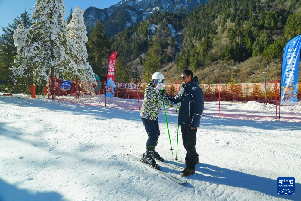 九寨華美勝地度假區(qū)穹恰冰雪大世界工作人員在協(xié)助游客體驗滑雪(2025年1月1日攝)。新華社發(fā)