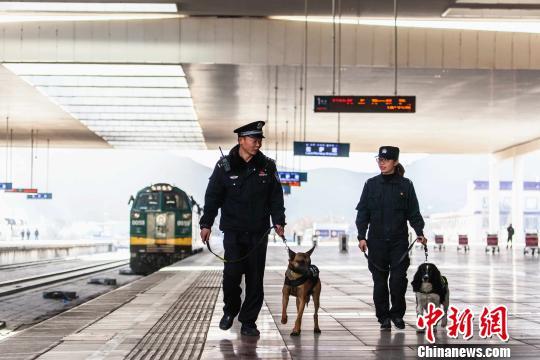 拉薩車站派出所民警惠旭東與見習(xí)民警易楠攜犬在站臺巡邏。 胡安鵬 攝