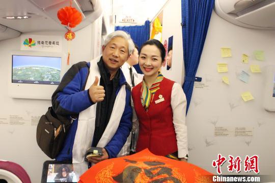“這是我第二次乘坐西藏航空的春節(jié)主題航班,去年這個時候是在飛機上包餃子,他們每次春節(jié)的活動都讓我記憶深刻?!背俗鞑睾娇蘸桨嗟目迪壬闷鹪挋C在機艙里說。